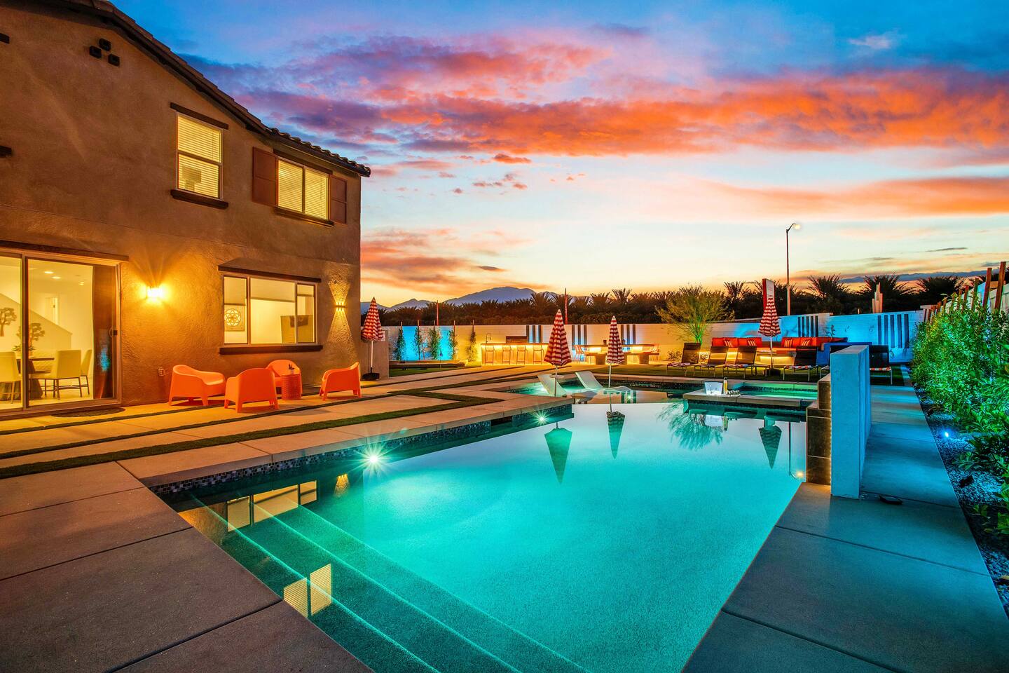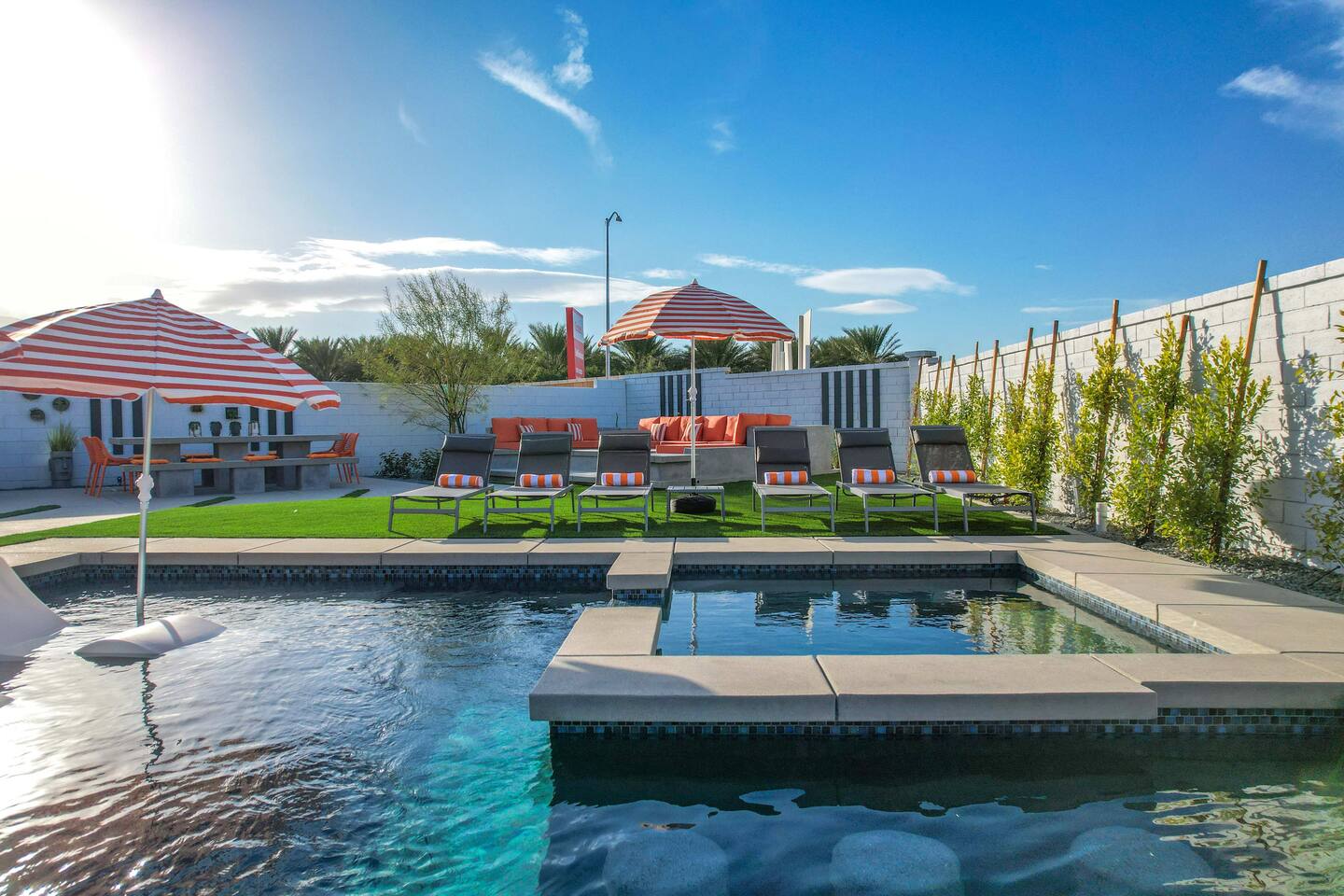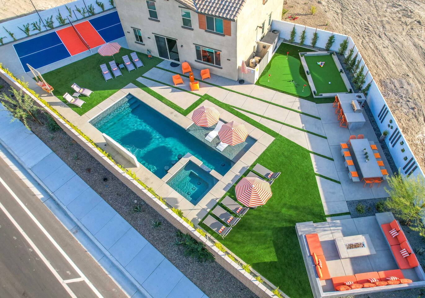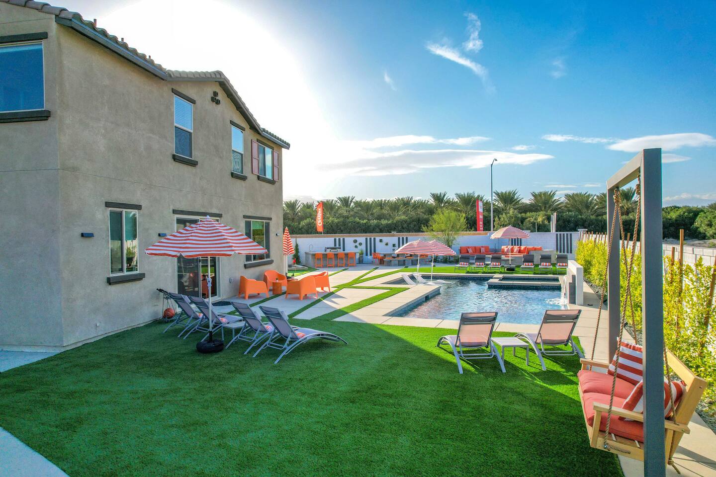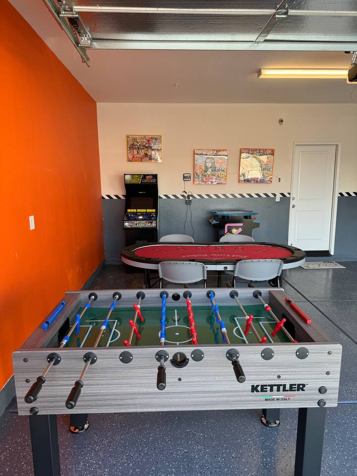 🏖️ Resort Style Pool: sip on cocktails at the in-water bar, relax on the tanning baja ledge, and soak in the spa jacuzzi near the waterfalls. Perfect for lazy afternoons, sunset swims, or nighttime dips. You'll never want to get out. ⛳ Backyard Fun: get competitive with friends & laugh it out playing mini golf, pickleball, and basketball... even a funny game of human-sized billiards! 🧖♀️ Backyard Chill: fire up the grill for a poolside BBQ or relax by the firepit lounge under the desert stars (perfect for group gossips & deep talks). 🛏️ Bedrooms & Baths: With 7 bedrooms & 11 beds that sleep 18, everyone in your group will feel luxury hotel-level comfort. Plush beds, fresh linens, and fully stocked bathrooms. 🕹️ Endless Entertainment: smart TVs, high-speed Wi-Fi throughout, and a game-ready arcade. Yes, an arcade, you read that right! 🍳 Fully Stocked Kitchen: complete with all the essentials — coffee maker, toaster, blender, and plenty of cookware. 🚗 Parking: 3 driveway spots & additional street parking. EV charging available too! 🐾 Pet-Friendly: your furry friends deserve a vacation too. * Please get in touch with us to get approval for your pets. There is a $150 pet fee. * Pool Heating: Available for $150/night for the full stay. Spa heating is complimentary. Bookings fill fast during events & high seasons — secure your dates now for a group getaway at this luxury Coachella vacation home!