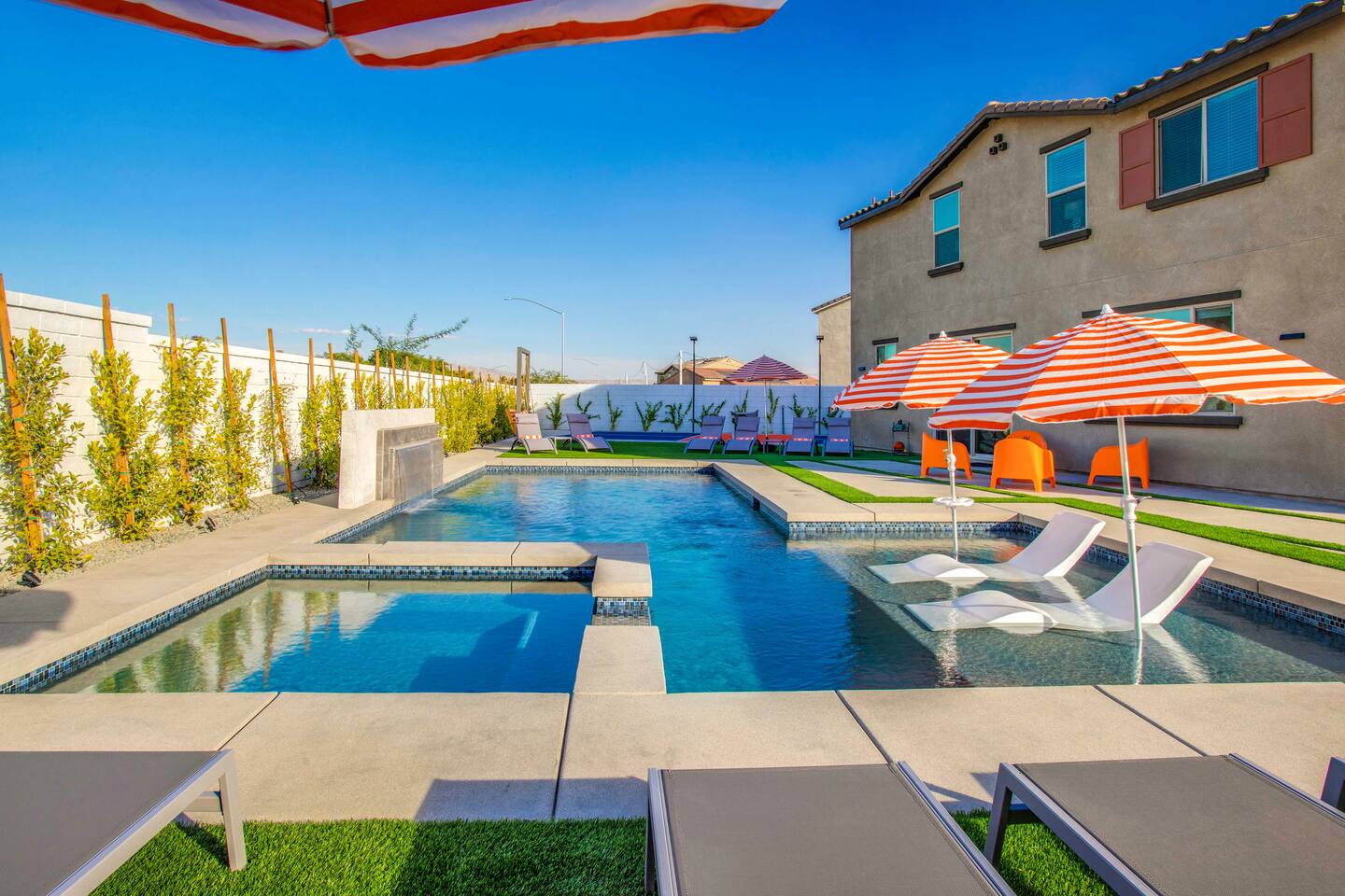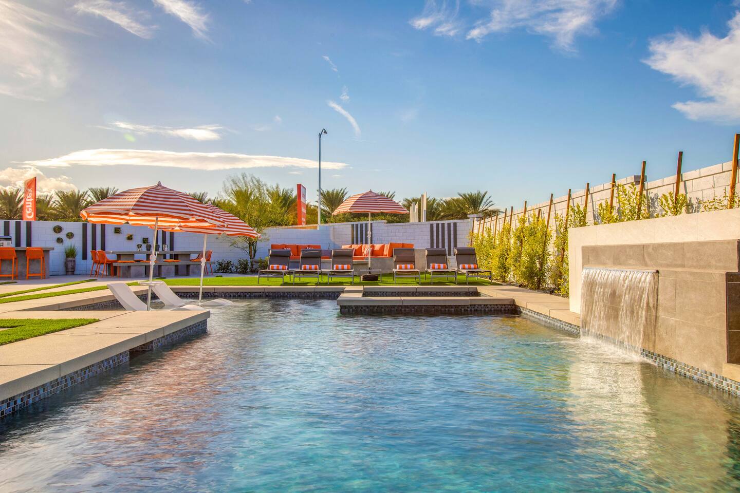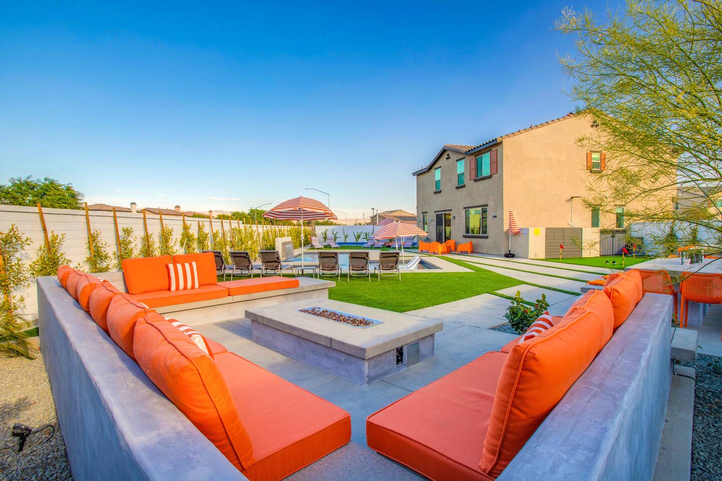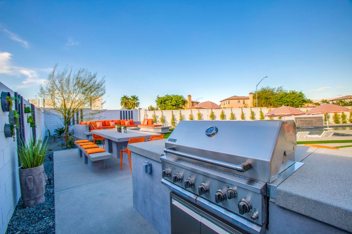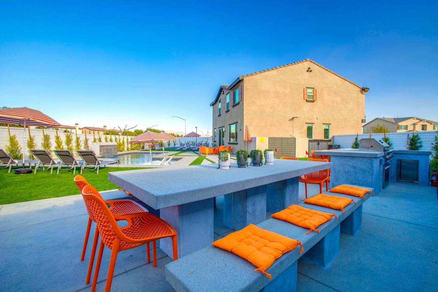 🏖️ Resort Style Pool: sip on cocktails at the in-water bar, relax on the tanning baja ledge, and soak in the spa jacuzzi near the waterfalls. Perfect for lazy afternoons, sunset swims, or nighttime dips. You'll never want to get out. ⛳ Backyard Fun: get competitive with friends & laugh it out playing mini golf, pickleball, and basketball... even a funny game of human-sized billiards! 🧖♀️ Backyard Chill: fire up the grill for a poolside BBQ or relax by the firepit lounge under the desert stars (perfect for group gossips & deep talks). 🛏️ Bedrooms & Baths: With 7 bedrooms & 11 beds that sleep 18, everyone in your group will feel luxury hotel-level comfort. Plush beds, fresh linens, and fully stocked bathrooms. 🕹️ Endless Entertainment: smart TVs, high-speed Wi-Fi throughout, and a game-ready arcade. Yes, an arcade, you read that right! 🍳 Fully Stocked Kitchen: complete with all the essentials — coffee maker, toaster, blender, and plenty of cookware. 🚗 Parking: 3 driveway spots & additional street parking. EV charging available too! 🐾 Pet-Friendly: your furry friends deserve a vacation too. * Please get in touch with us to get approval for your pets. There is a $150 pet fee. * Pool Heating: Available for $150/night for the full stay. Spa heating is complimentary. Bookings fill fast during events & high seasons — secure your dates now for a group getaway at this luxury Coachella vacation home!